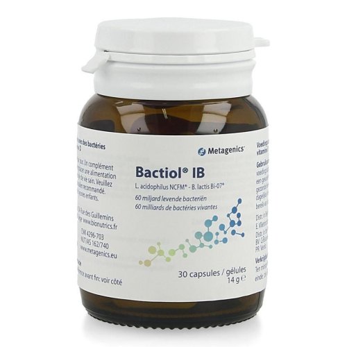 Milchsäurebakterien, Cholecalciferol, Hydroxypropylmethylcellulose, mikrokristalline Cellulose, Silica, Magnesiumsalze von Fettsäuren.Verwendung von Metagenics Bactiol IB: