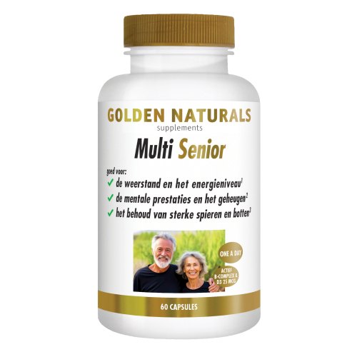 Optimales Multiplikator-Modell für über 60-Jährige!Mit zunehmendem Alter verändern sich unsere Körper und damit auch unsere Bedürfnisse an Vitaminen und Mineralstoffen. Golden Naturals Multi Senior wurde speziell für Senioren (ab 60 Jahren) entwickelt und dient als Ergänzung zur täglichen Ernährung. Thiamin (Vitamin B1), Vitamin B12, Vitamin C und Kalzium unterstützen das Energieniveau. Vitamin B12, Vitamin C und Vitamin D3 tragen außerdem zu einem starken Immunsystem bei. Vitamin B12 spielt eine Rolle bei der Zellteilung, und Vitamin C trägt zur Stärkung der Blutgefäßwände bei. Multi Strong Senior enthält zudem Folsäure (Folat) und Vitamin A. Dieses Multivitaminpräparat enthält außerdem weitere wertvolle Nährstoffe wie Lutein, Zeaxanthin, Kalzium, Coenzym Q10 und das natürliche Antioxidans Pterostilben. Multi Strong Senior ist kupfer- und eisenfrei (keine Anreicherungsgefahr).