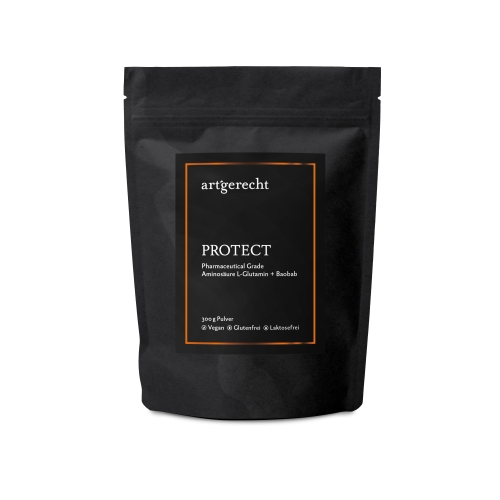 Die Kombination aus reinem L-Glutamin mit ballaststoffreichem Baobab ist ideal für Darm, Mikrobiom, Verdauung und Immunsystem. Glutamin lässt sich problemlos synthetisch herstellen. Eine deutlich hochwertigere und artgerechtere Alternative ist die Fermentation. Dieses Verfahren ist sehr aufwendig und erfordert viel Erfahrung und modernste Technologie. PRO’TECT enthält 100 % freies L-Glutamin. Es muss nach der Einnahme nicht verdaut werden, sondern steht dem Körper sofort zur Verfügung. Die Eigenschaften von L-Glutamin, kombiniert mit den Nährstoffen des Baobab, machen das neue PRO’TECT zu einem „Darmwunder“.