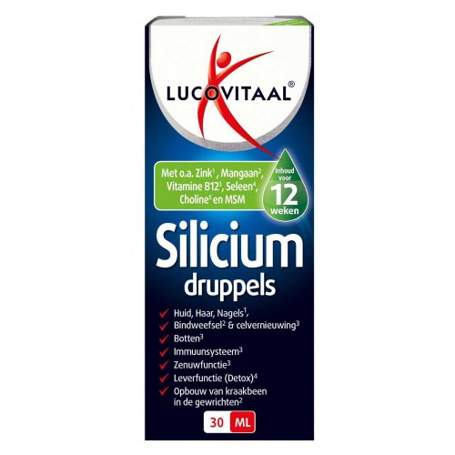Lucovitaal Silicium Druppels enthalten Zink, Vitamin B12, Mangan, Cholin, Selen und MSM. Ortho-Kieselsäure ist eine Form von Silizium, die vom menschlichen Körper leicht aufgenommen wird. Zink ist gut für die heilende Wirkung der Haut, für glänzendes Haar und für die Nägel. Darüber hinaus trägt es zur Erhaltung starker Knochen bei. Vitamin B12 in dieser Formel trägt zur Zellerneuerung bei, unterstützt das Immunsystem und ist gut für das Nervensystem. Mangan hilft bei der normalen Bildung von Bindegewebe und ist gut für den Aufbau von Knorpel in den Gelenken. Cholin unterstützt die reinigende Wirkung der Leber. Selen in dieser Formel trägt zu einem normalen Haarwachstum bei und wirkt zellschützend.Zusammensetzung von Lucovitaal Silicium Druppels: