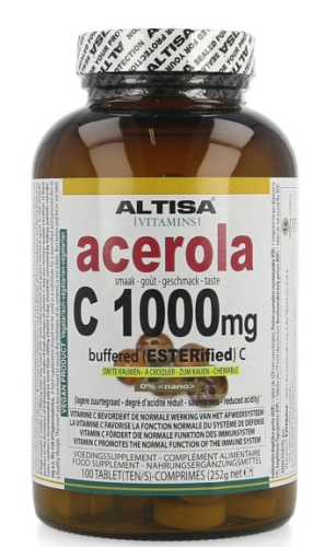 Das Vitamin C in unseren Kautabletten ist eine veresterte (entsäuerte/gepufferte), zahnfreundliche und besser resorbierbare Form von Vitamin C, die durch einen Veresterungsprozess mit dem notwendigen Mineralstoff (Natriumascorbat) gewonnen wird. Diese Kautabletten enthalten außerdem die sehr empfehlenswerten Vitamin-C-unterstützenden Substanzen Acerola, Hagebutte, Rutin und Bioflavonoide auf einer Basis aus schwarzem Pfefferextrakt (für maximale Vitamin-C-Aufnahme) und Blaubeere.Zusammensetzung von Altisa Acerola C1000 mg Buffered: