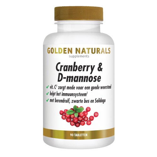 Cranberry: eine wunderbar kraftvolle Beere!Golden Naturals Cranberry & D-Mannose ist eine Kombination aus Cranberry-Extrakt, D-Mannose, Vitamin C und verschiedenen wohltuenden Kräuterextrakten wie Bärentraube, Brennnessel und Goldrute (Solidago virgaurea). Vitamin C ist ein bekanntes Antioxidans mit positiver Wirkung auf das Immunsystem. Dieses Produkt enthält satte 750 mg Cranberry-Extrakt pro Tagesdosis (3 Tabletten). Der Cranberry-Extrakt in diesen Tabletten ist konzentrierter als beispielsweise Cranberrysaft. Die positiven Eigenschaften dieser kraftvollen Beere waren bereits den Ureinwohnern Nordamerikas bekannt. In den Niederlanden wachsen Cranberries hauptsächlich auf Terschelling und Vlieland. Sie sind eine gängige Zutat in der europäischen Küche, werden aber in den letzten 20 Jahren zunehmend auch in Gesundheitsprodukten verwendet. Die Bärentraube ist seit Mitte des 18. Jahrhunderts für ihre gesundheitsfördernde Wirkung bekannt.