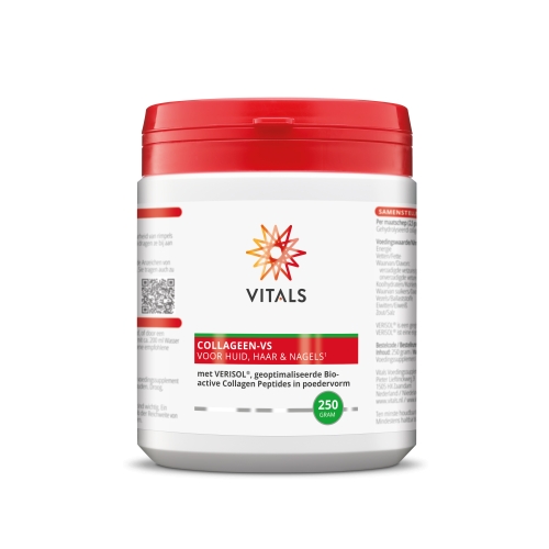 Vitals Collagen-VS enthält eine reine Form bioaktiver Kollagenpeptide mit der Marke VERISOL®.Kollagenpeptide bestehen aus kurzen Proteinketten mit spezifischer Form und Zusammensetzung, die durch Zerschneiden von natürlichem Kollagenprotein in kleinere Stücke hergestellt werden. Die Kollagenpeptide in Collageen-VS werden von der deutschen Firma Gelita hergestellt, die über langjährige Erfahrung in der Herstellung von Kollagenproteinprodukten aller Art verfügt. Ihr patentiertes Produktionsverfahren gewährleistet Kollagenpeptide, die aufgrund ihrer spezifischen Form und ihres Molekulargewichts eine optimale Bioverfügbarkeit aufweisen.