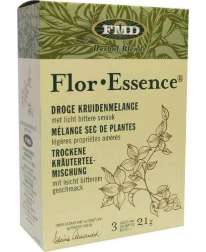 Large clover (arctium lappa L), schapenzuring (rumex acetosella L), red iep (ulmus rubra muhl), gladgesteeld fingerweed (laminaria digitata (Hudson) JV Lam), blessed thistle (cnicus benedictus L), white watercress (nasturtium officinale R. Brown), red claver (R. L.), Russian claver (Lfolium). rhubarb root (rheum palmatum L).Use of FMD Flor Essence Droge Kruidenmelange: