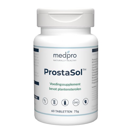 Plant sterols (soy), BCM95™ DC (Curcuma longa), LinumLife®, Quercetin powder, Pygeum africanum bark powder, Ginseng extract, Saw Palmetto (Serenoa repens) extract, Resveravin, Ganoderma lucidum extract, Polygonum cuspidatum root extract, Natural soy extract (soy), Fillers (Microcrystalline cellulose, Stearic acid, Calcium hydrogen phosphate), Anti-caking agents (Magnesium stearate, Silicon dioxide), Disintegrant (Sodium starch glycolate), Coating (hydroxypropyl methylcellulose).Use of Medpro ProstaSol:
