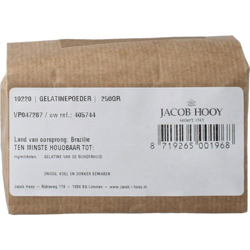 Gelatin is a peptide protein mixture. High-quality bovine gelatin has been used for this product.Ingredients of Jacob Hooy Gelatinepoeder: