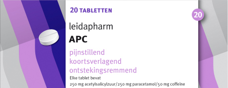 The active ingredients in this medicine are 250 mg acetylsalicylic acid, 250 mg paracetamol, and 50 mg caffeine. The other ingredients are lactose, microcrystalline cellulose, hydrogenated vegetable oil, and hydrogenated castor oil.Usage of Leidapharm APC: