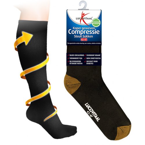 Painful legs, varicose veins, swelling, cramps, sweaty feet? Lucovitaal Copper Woven Compression Support Socks offer relief!These Copper Woven Compression Support Socks apply gentle pressure to your feet, ankles, and legs, stimulating blood circulation. This reduces pain, cramps, cold feet, varicose veins, and swelling. The socks provide the right support for your ankles, calves, and feet, for optimal leg performance!