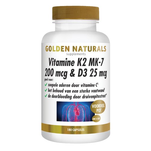 The powerful combination of vitamin K2 and D3 is becoming increasingly well-known. Both vitamins enhance each other's effectiveness (synergy). This product from Golden Naturals contains patented vitamin K2 (menaquinone-7) and vitamin D3 from cholecalciferol. It also contains vitamin C, which benefits elastic veins and supports the maintenance of strong blood vessel walls and strong bones. OPC from grape seed extract is good for blood circulation*. Vitamin K is beneficial for normal bone formation and blood clotting. Vitamin D stimulates the production of vitamin K-dependent proteins. Furthermore, it ensures that calcium reaches the right places in the body and is properly absorbed. This is important for maintaining strong bone tissue. Vitamin D is also important for the cell renewal process and supports the body's immune system. This product is not suitable for use with blood thinners: consult a doctor before use if you are ill or taking (anticoagulant) medication.*Health claim evaluation is ongoing.