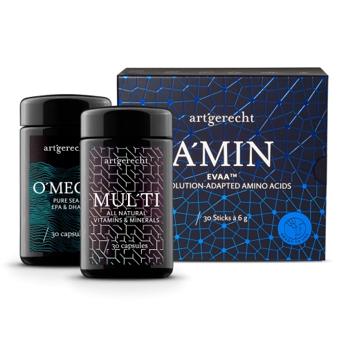 Small changes are often enough to initiate processes in the body that positively impact our lifestyle and well-being. That's why we've combined three products that optimally complement our diet. With A'MIN, MUL'TI, and O'MEGA, the DAI'LY package contains over 1,000 bioactive substances. They provide the body with the nutrients, amino acids, and healthy fatty acids it needs daily.This package contains: