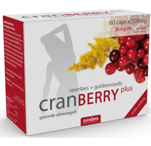 Vaccinium macrocarpon (American cranberry)(36%), gelling agent: hydroxypropyl methylcellulose, bulking agent: cellulose, Solidago virgaurea (goldenrod)(10%), Malpighia punicifolia (acerola)(5%), Vaccinium myrtillus (bilberry)(5%), anti-caking agent: silicon dioxide.Use of Purasana Cranberry Plus Veenbes + Guldenroede: