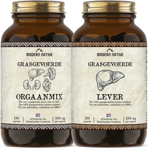 Organ mix:20% Freeze-dried grass-fed beef liver, 20% Freeze-dried grass-fed beef heart, 20% Freeze-dried grass-fed beef kidney, 20% Freeze-dried grass-fed beef spleen, 20% Freeze-dried grass-fed beef adipose gland, Bovine gelatin (capsules).