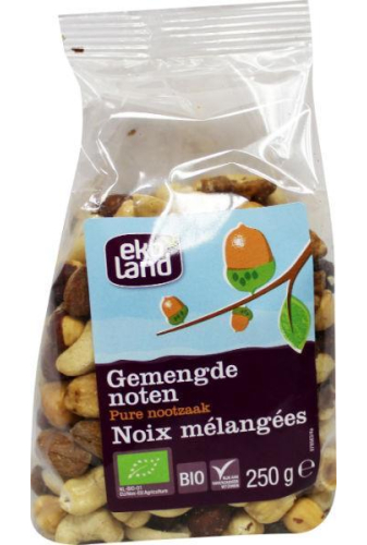 Ekoland gemengde noten bestaat uit een combinatie van hazelnoten, amandelen, walnoten, cashewnoten en paranoten.Natuurlijk lekker als tussendoortje, maar ook voor bijvoorbeeld een notenpannenkoek.