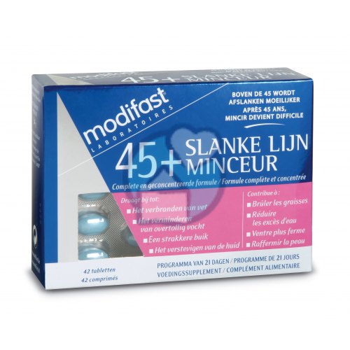 Boven de 45 wordt afslanken moeilijker. Vanaf de leeftijd van 45 jaar verandert het basaal metabolisme en komen de kilo's erbij zonder dat je je eetgewoonten wijzigt. Om dergelijke en andere ongemakken die eigen zijn aan deze leeftijd tot een minimum te beperken, is er Modifast Laboratoires 45+ Slanke Lijn.