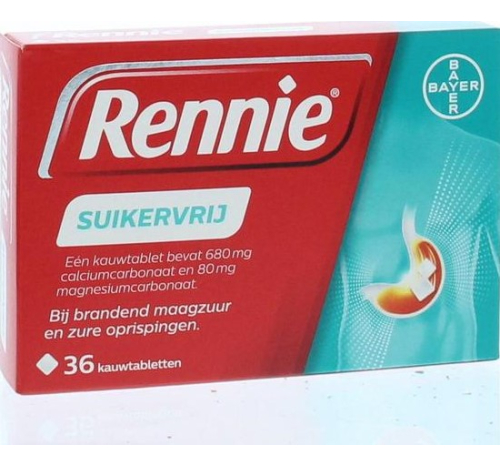 Rennie Suikervrij met frisse spearmint smaak is verkrijgbaar in verpakkingen van 36 en 72 tabletten. Ook geschikt voor diabetici. Lees voor gebruik de bijsluiter
