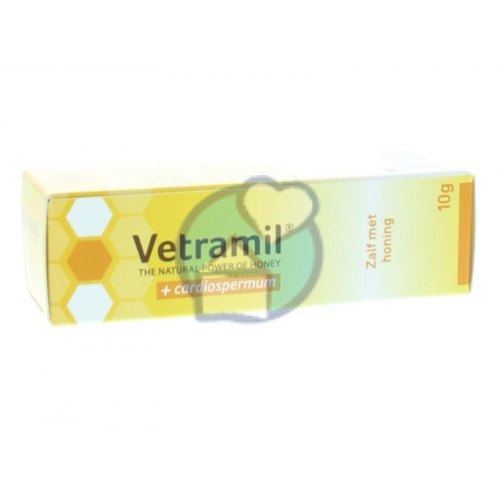 Cetostearyl-alcohol, natrium-laurylsulfaat, isopropyl-meristaat, paraffine, witte vaseline, honing, etherische oliën, Cardiospermum.Gebruik van Vetramil Wondzalf met Honing: