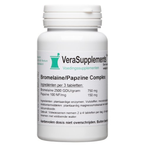 BioVitaal Bromelaine Papaine+ Complex is een combinatie van de plantaardige enzymen bromelaïne en papaïne. Bromelaïne en papaïne zijn eiwitsplitsende enzymen.Samenstelling van VeraSupplements Bromelaine Papaine+ Complex: