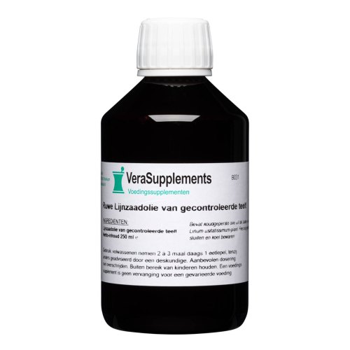 250 ml koudgeperste, ongeraffineerde olie uit lijnzaad (Linum usitatissimum Linaceae) van gecontroleerde teelt.Gebruik van VeraSupplements Ruwe Lijnzaadolie: