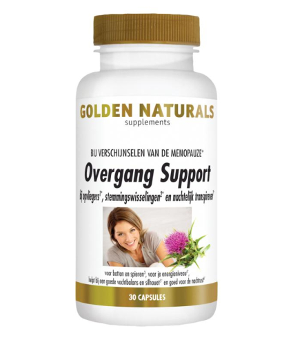 De overgang is het begin van een nieuwe levensfase en duurt gemiddeld 5 tot 10 jaar. Het vrouwelijk lichaam laat de vruchtbare periode achter zich en maakt ruimte voor een nieuwe hormoonbalans. Die veranderende hormonen kunnen zorgen voor overgangsverschijnselen, zowel lichamelijk als mentaal. Tijdens de overgang ervaart 80% van de vrouwen fysieke ongemakken, zoals opvliegers, stemmingswisselingen en nachtelijk transpireren. Golden Naturals Overgang Support bevat kruidenextracten zoals salie en zilverkaars die het lichaam ondersteunen en de verschijnselen van de overgang verlichten*. Zo helpt salie bij opvliegers* en zilverkaars bij stemmingswisselingen en nachtelijk transpireren*. Artisjok helpt bij een goede vochtbalans en het behoud van je silhouet*. De natuurlijke ingrediënten van dit product zijn goed verdraagbaar, zodat je het lange tijd kunt blijven gebruiken.*Evaluatie gezondheidsclaim is lopende.