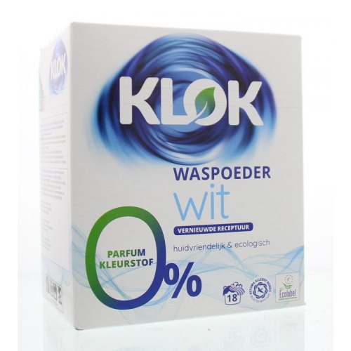 De waspoeders van Klok Eco zonder parfum en kleurstoffen zijn verkrijgbaar in doosjes van 1,215 kg. Goed voor 18 wasbeurten.