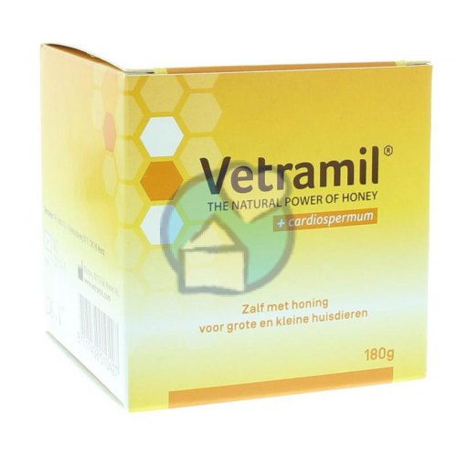 Cetostearyl-alcohol, natrium-laurylsulfaat, isopropyl-meristaat, paraffine, witte vaseline, honing, etherische oliën, Cardiospermum.Gebruik van Vetramil Wondzalf met Honing in Pot: