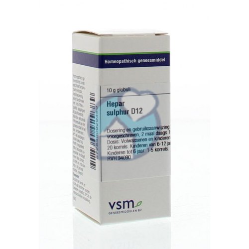 Voor de bereiding zijn hulpstoffen gebruikt. Korrels (globuli/granules) zijn gemaakt van bietsuiker (saccharose).Gebruik van VSM Enkelvoudige Homeopathie Hepar Sulphur D12:
