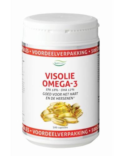 Visolie Omega-3 van Nutrivian bevat per capsule 1000 mg zuivere visolie.Deze visolie bevat omega-3 vetzuren waarvan 18% van het omega-3 vetzuur EPA en 12% DHA.