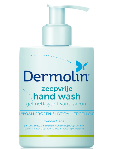 De zeepvrije hand wash van Dermolin is daar bijzonder geschikt voor, omdat die zo min mogelijk allergenen bevat en daarbij de beschermlaag van uw handen niet onnodig wordt aangetast door de zeepvrije formule.