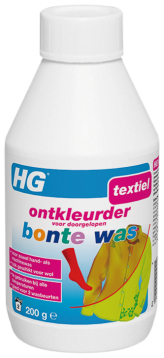 HG ontkleurder voor doorgelopen bonte was herstelt kledingstukken die verkleurd zijn door het meewassen van een niet kleurecht kledingstuk.Het product is zowel geschikt voor de machinewas als de handwas.