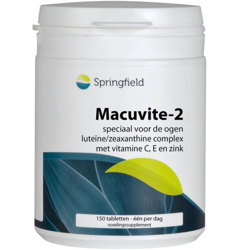 Vitamine C (L-ascorbinezuur), Vulstof (microkristallijne cellulose), Vitamine E (tocoferol acetaat), Zink (L-Methionine), Tagetes erecta extract (bevat Luteïne en Zeaxanthine), Antiklontermiddel (magnesiumstearaat, siliciumdioxide), Koper (gluconaat), Glansmiddel (HPMC), Bevochtigingsmiddel (glycerol).Gebruik van Springfield Macuvite-2: