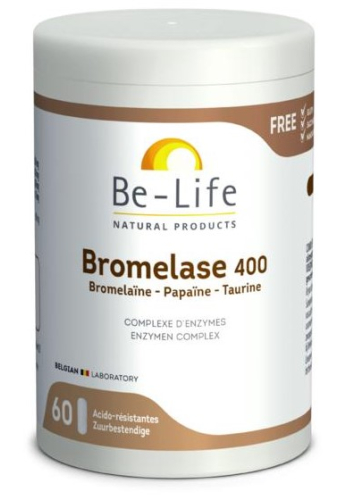 Be-Life Bromelase 400 bevat twee enzymen afkomstig van exotisch fruit versterkt door Taurine. Het is een volledig natuurlijk en van oorsprong plantaardig enzymencomplex. Bromelase 400 combineert een hoge concentratie bromelaïne en papaïne, twee natuurlijke enzymen, met taurine, een zwavelhoudend aminozuur dat de synergie van de formule nog versterkt. De samenstelling van de capsule maakt dat ze niet afgebroken wordt door het maagzuur en pas voorbij de maag werkzaam wordt.Samenstelling van Be-Life Bromelase 400: