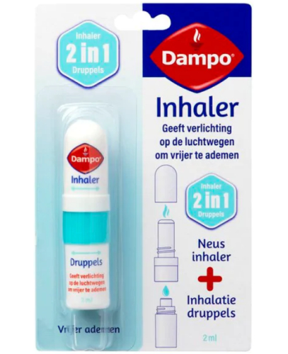 Dampo 2-in-1 inhaler geeft verlichting op de luchtwegen om vrijer te ademen.De 2-in-1 bestaat uit een neusinhaler en inhalatiedruppels. De druppels zijn geschikt voor zowel een stoombadje als in een zakdoek.