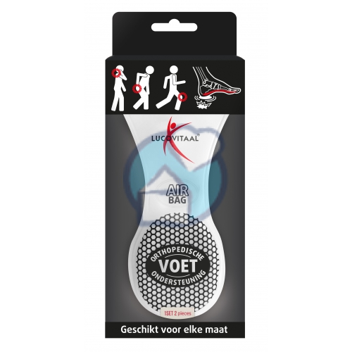 De Orthopedische Voet Ondersteuning (Airbags) van Lucovitaal gaat verder dan het comfort aan de voeten. Wanneer de hiel van de voet contact maakt met de ondergrond, absorbeert de airbag, gemaakt van polyurethaan, de schok van de hiel. De airbag is zo gemaakt dat het de voetboog ondersteunt, ook bij platte voeten en voeten met een hoge voetboog. De airbag verlicht pijn en corrigeert de lichaamshouding. Geschikt voor iedere soort schoen en alle maten.Dit product behoort tot de categorie: Voetverzorging
