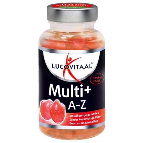 Lucovitaal suikervrije gummies is een range van verschillende, suikervrije snoepgummies, die daarnaast ook nog eens vegetarisch of vegan zijn. Alle gummies zijn verrijkt met extra nutriënten die bijdragen aan de gezondheid van gebruiker. De doseringsvorm in een gummie maakt het mogelijk dat zowel kinderen als ouderen de voedingsstoffen makkelijk binnenkrijgen, omdat deze vorm aantrekkelijk is voor beide doelgroepen.Multi+ A-Z is speciaal samengesteld voor volwassenen. De formule bevat o.a. Vitamine C wat mede zorgt voor een goede weerstand, Vitamine D3 wat de botten ondersteunt en Vitamine B12 ter ondersteuning van het energieniveau. Daarnaast bevatten de gummies extra Vitamine B3, en E *. De gummies hebben een heerlijke aardbeiensmaak.