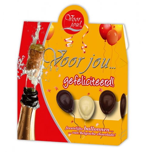 Chocoladeballonnen van Belgische chocolade in melk, wit en puur in een prachtig, origineel cadeaudoosje.Ideaal voor verjaardagen, geslaagden, jubilea, enz.