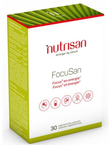 Vulstof (microkristallijne cellulose), Ginseng, capsule (hydroxypropylmethylcellulose), stabilisator (carrageen) en conserveermiddel (kaliumacetaat), antiklontermiddelen (siliciumdioxide, magnesiumstearaat), pyridoxal-5'-fosfaat, natirumriboflavine-5'-fosfaat, thiamine HCl, methylcobalamine.Gebruik van Nutrisan FocuSan: