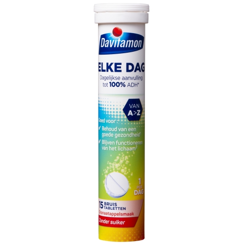 Je lichaam heeft elke dag, het hele jaar door, vitamines en mineralen nodig om goed te blijven functioneren en een goede gezondheid in stand te houden. Gezond en gevarieerd eten is de basis om voldoende vitamines en mineralen binnen te krijgen. Het lukt niet iedereen om altijd elke dag volgens de adviezen van de Schijf van Vijf te eten. Dan kan een aanvulling in de vorm van een voedingssupplement raadzaam zijn.Samenstelling van Davitamon Elke Dag Bruis: