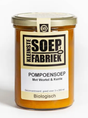 De rijke smaak van Nederlandse pompoen en wortel in combinatie met de pittige currykruiden zorgt voor deze romige, rijkgevulde soep.In het fabriekje maakt Kleinste Soep Fabriek, met een enthousiast team en 658 zonnepanelen, met veel plezier soep en bouillon. Op de ouderwetse manier: met tijd, zorg en aandacht. Dan is soep het allerlekkerst. Door de ambachtelijke productie ontstaan avontuurlijke smaaknuances.