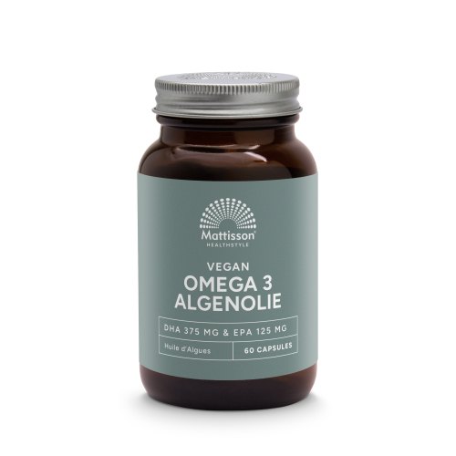 Algenolie is een 100% plantaardig Omega 3 supplement en een duurzame en vegan vervanger voor Omega 3 uit visolie. DHA is een belangrijke bouwsteen voor de hersenen en EPA en DHA dragen bij tot de normale werking van het hart. Het gunstige effect wordt verkregen bij een dagelijkse inname van 250 mg EPA en DHA.Samenstelling van Mattisson Vegan Omega 3 Algenolie DHA 375 mg / EPA 125 mg :