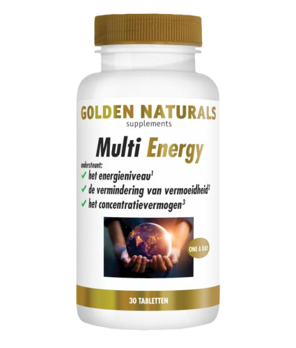 Golden Naturals Multi Energy is een samenstelling van vitaminen, mineralen, kruidenextracten en andere nutriënten met specifieke aandacht voor je energieniveau. Een handige one a day-tablet met ijzer, vitamine B12 en foliumzuur in bioactieve vorm. Dit krachtige trio draagt bij tot vermindering van vermoeidheid en activeert je natuurlijke energie in het lichaam. Uiteraard is er bij deze multi ook gedacht aan ondersteuning van je immuunsysteem door toevoeging van vitamine B12, vitamine D3 en zink. Zink helpt daarnaast bij stress/spanning in stress-situaties. Aan deze ‘energiemulti’ zijn onder andere ook nuttige nutriënten zoals vitamine B1 en B2, vitamine K2, co-enzym Q10, jodium, magnesium, maca, rozewortel (rhodiola) en ashwagandha toegevoegd.Samenstelling van Golden Naturals Multi Energy: