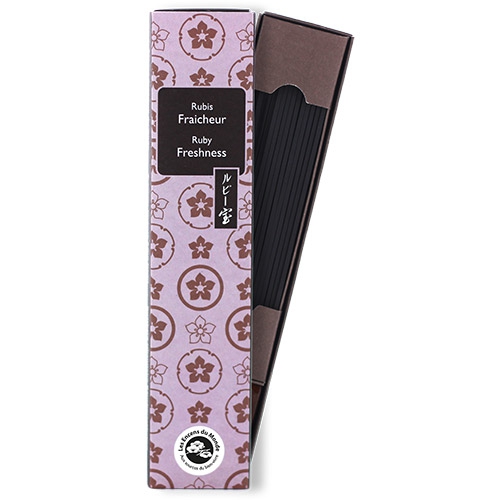 Ruby staat voor Freshness. Een uitzonderlijk zachte en poederachtig geurende wierook.Ervaar de subtiliteit van deze uitzonderlijke Japanse wierook. Elke geur uit de serie Karin is een poëtische compositie geïnspireerd door de Japanse roman ‘A tale of Genji’. Een roman geschreven in de 10de eeuw toen de wierook zijn hoogtij kende aan het Japanse Hof en de kunst van het ruiken zijn intreden deed. De brandtijd van een stokje is circa 30 minuten.