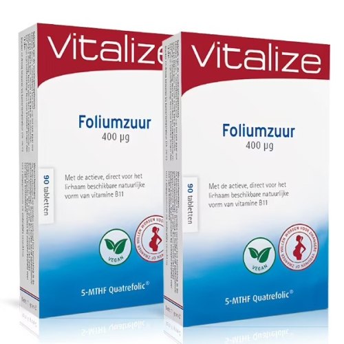 Vitalize Foliumzuur 400 mcg is een goede aanvulling voor vrouwen met een kinderwens of die zwanger zijn. Foliumzuur is belangrijk in de 4 weken voor en 10 weken na de conceptie. Het draagt bij tot de groei van de placenta en de ontwikkeling van de ongeboren baby.Een lage folaatstatus is een risicofactor voor het ontstaan van een open rµggetje bij de zich ontwikkelende baby. Foliumzuur suppletie verhoogt de folaatstatus van de moeder. Met slechts 1 tablet per dag krijg je de door Gezondheidsraad aanbevolen dagdosering van 400 mcg (microgram) binnen.