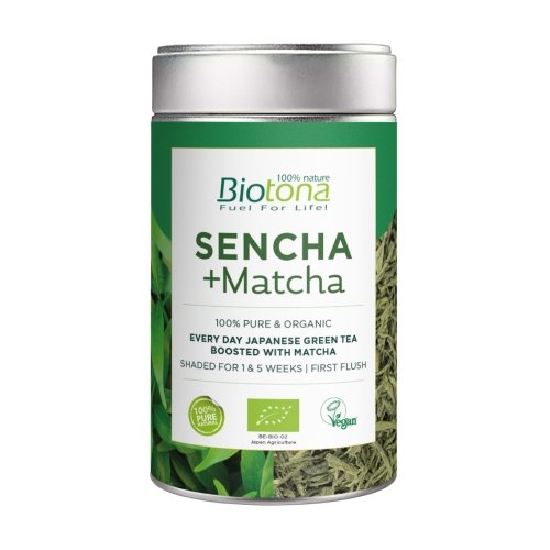 Biotona Bio Sencha + Matcha is een blend van losse Groene Thee en poeder die de complementaire smaken van beide verrassend combineert. Sencha is een alledaagse Groene Thee met een zoete, lichtbittere smaak. Matcha is een verfijnde Groene Thee met een rijke en intense “umami” smaak. Beiden worden ze gemaakt van jonge theeblaadjes, traditioneel begin mei geoogst (de eerste oogst), na een overschaduwing van respectievelijk 1 week en 5 weken.Ingrediënten van Biotona Sencha + Matcha Biologisch: