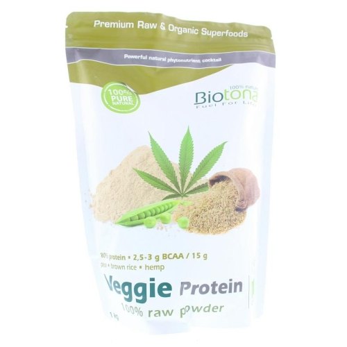 Biotona Veggie Protein Raw.Biotona Bio Veggie Protein Raw is een optimaal complex van excellente plantaardige eiwitbronnen. Het levert een compleet spectrum aan Aminozuren door de combinatie van een geconcentreerde Eiwitfractie uit bruine rijst (met een aminozuurprofiel dat zeer dicht aansluit bij dat van moedermelk) en Eiwitpoeder uit erwt en hennepzaden. Biotona Veggie Protein is ontwikkeld om te voldoen aan de eiwitbehoeften van vegetariërs/veganisten, sporters, of bedoeld voor mensen die een alternatieve, plantaardige maar kwalitatieve Eiwitbron zoeken voor dagelijks gebruik. Biotona Veggie Protein bevat per portie van 15 g ongeveer 2,5-3 g BCAA’s (= vertakte keten aminozuren; (iso)leucine en valine). BCAA’s maken tot 40% deel uit van de lichaamseiwitten, komen direct in de circulatie terecht en kunnen bijzonder goed ingebouwd worden in het spierweefsel.