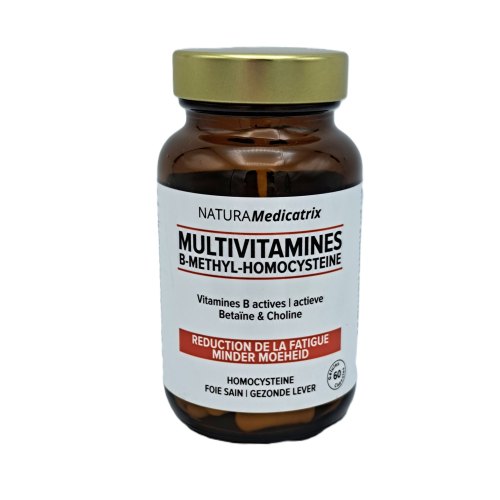 Betaïne (trimethylglycine), vulstof: Arabische gom, choline (bitartraat), plantaardige capsule: hydroxypropylmethylcellulose, zinkbisglycinaat, vit. B3, B5, B6 actief (pyridoxaal-5'-fosfaat), B2 actief (riboflavine-5'-fosfaat), B1, B9 actief (calcium-L-5-methyltetrahydrofolaat), B8 en B12 actief (methylcobalamine).Gebruik van NaturaMedicatrix Multivitamines: