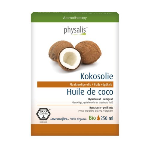 Physalis Kokosolie biologisch.Physalis bio Kokosolie is een transparante olie met een aangenaam, mild kokosaroma geperst uit het witte vruchtvlees (copra) van de vrucht van de kokospalm. Ze is vast bij kamertemperatuur en smelt bij lichaamstemperatuur (vloeibaar > 25°C). Kokosolie is ideaal als gelaats- en lichaamsolie dankzij haar verzachtende en hydraterende werking. Kokosolie bevat veel laurinezuur met een reinigende werking. Dankzij het hoge smeltpunt is kokosolie ideaal om geïrriteerde, rode huid (vb. bij zonnebrand) te verkoelen en te verzorgen. Ze heeft bovendien voedende en verzorgende eigenschappen voor zowel huid als haar.