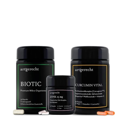 De Microbiome Balance Set is een speciaal ontwikkelde set voedingssupplementen die gericht is op langdurige, duurzame ondersteuning van de darmgezondheid en de balans van het microbioom. Het combineert zorgvuldig geselecteerde ingrediƫnten, waaronder een hoge dosering organisch Zink, Biotic en Curcumin Vital ter ondersteuning van de spijsvertering, het immuunsysteem en het algemene welzijn.Zink helpt het immuunsysteem te versterken, beschermt cellen tegen oxidatieve stress en ondersteunt tegelijkertijd de regeneratie en integriteit van het darmslijmvlies. Biotic ondersteunt de balans van de darmflora met hoogwaardige probiotische culturen, terwijl Curcumin Vital een ontstekingsremmende werking heeft in de darmen en bijdraagt aan het algemene welzijn.