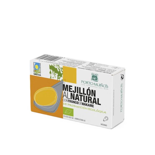 Mosselen geteeld aan vlotten in Galicische (Spanje) estuaria met de nerf van wakame. Biologisch gecertificeerd. De ?vlotten zijn houten constructies met hangende touwen die worden gebruikt voor mosselkweek. In Galicië dateert de oorsprong van deze duurzame methode terug tot het midden van de 20e eeuw. Vlotten vertegenwoordigen een kenmerk van het kustlandschap, net zo belangrijk als "horreos, de traditionele graanschuren van Galicië" op boerderijen.Ingrediënten van Porto Muinos Mosselen met Wakame Biologisch: