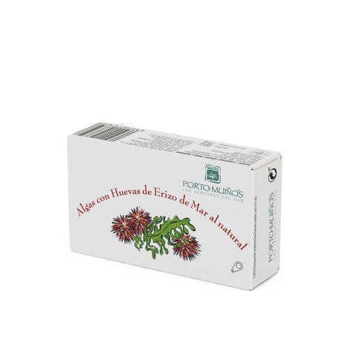 Authentieke zee-egelkuit van de Galicische kust (Spanje) met zeewier, in blik. De zee-egel is een schelpdier met een gladde consistentie, oranje kleur, intense smaak en rijk aan eiwitten.Ingrediƫnten van Porto Muinos Zee Egel Kuit met Wakame: