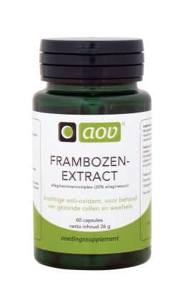 AOV's Frambozen-extract 200 mg is een hoogwaardig product dat wordt gewonnen uit gevriesdroogde frambozen (Rubus idaeus) met een optimaal behoud van gunstige eigenschappen. Frambozen bevatten organische zuren, vitamine C (20–30 mg/100 g vers product) en zijn rijk aan bioflavonoïden zoals anthocyanidinen, waaronder diverse quercetine-verbindingen. Het belangrijkste kenmerk echter is het zeldzaam hoge gehalte aan ellagitanninen, die de framboos tot een exclusieve bosvrucht maken. Een capsule Frambozen-extract 200 mg levert ongeveer evenveel ellagitanninen als een schaaltje verse frambozen.